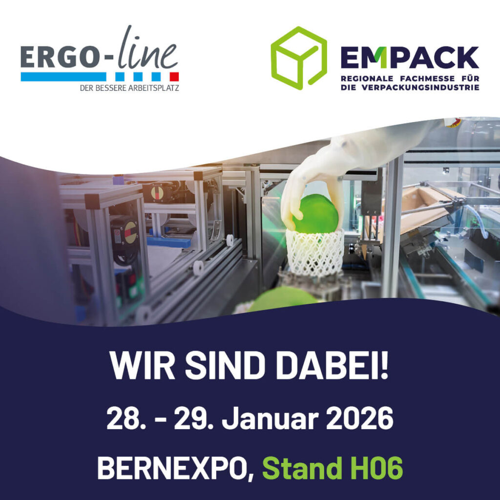 Wir freuen uns sehr, bekannt zu geben, dass ERGO-line, die modularen und ergonomischen Arbeitsplatzsysteme aus dem Hause Kern Studer AG, als Aussteller auf der EMPACK Schweiz 2026 vertreten sein wird! Vom 28.–29. Januar 2026 sind wir in der Messe Bern für Sie vor Ort – Sie finden uns am Stand H06.